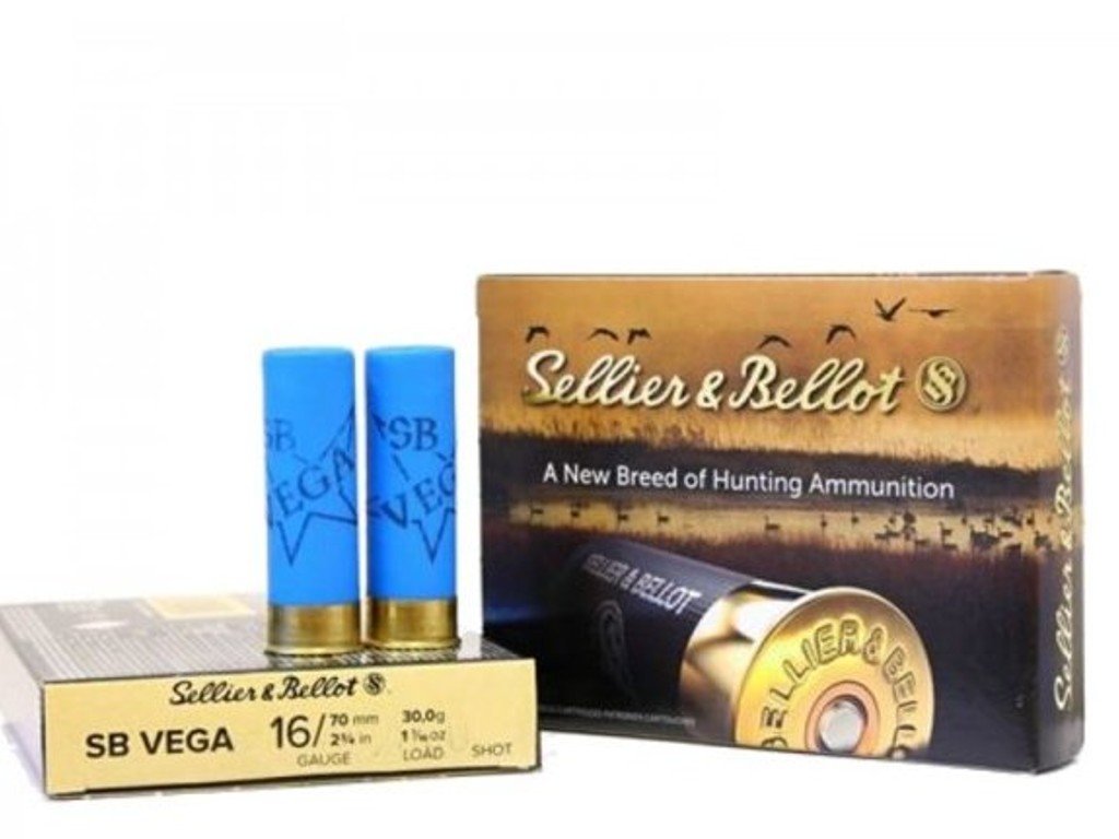Oblíbené brokové náboje - střelivo českého výrobce, firmy Sellier & Bellot v ráži 16x70 v plastové nábojnici s košíkem.
