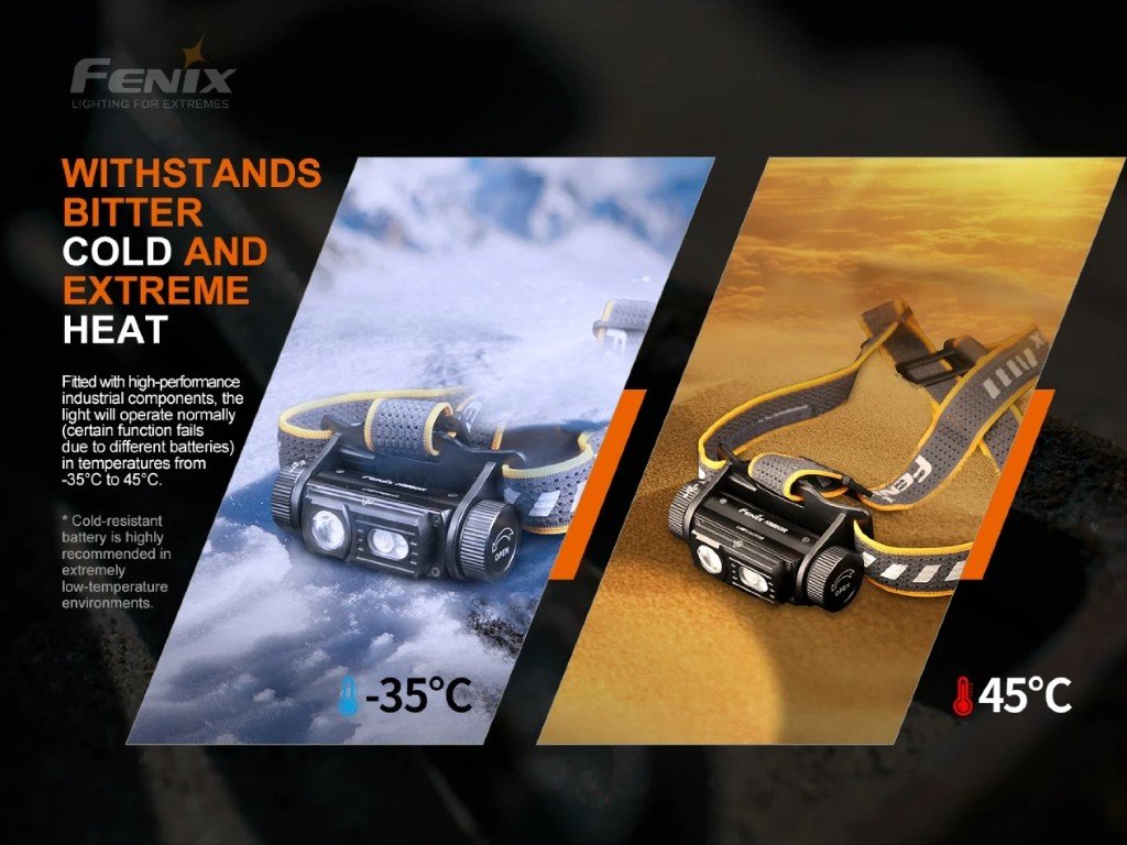 Fenix HM60R je vysoce výkonná nabíjecí čelovka, která v hlavním reflektoru nabízí světelný tok až 1200 lumenů s dosvitem 116 metrů. Druhý reflektor s výkonem až 350 lumenů má světelnou stopu velmi širokou a plynulou s neutrálním odstínem světla (neutral white). Výhodou tohoto odstínu je přirozenější a kontrastnější podání barev v terénu. Ovládání obou LED je na sobě nezávislé a použití čelovky je tak velmi jednoduché (kužely však nelze kombinovat). Čelovka disponuje navíc i červeným světlem s výkonem 5 lumenů. Součástí balení je i nabíjecí Li-ion akumulátor typu 18650 s kapacitou 2600 mAh, který se nabíjí přímo v čelovce přes USB-C konektor. Čelovka navíc v režimech 130 a 350 lumenů nabízí v dálkovém reflektoru speciální funkci nazvanou "FREQUENCY SENSING", kdy v těchto režimech detekuje pohyb a umí dle rychlosti běhu (frekvence kroků) automaticky upravovat výkon vůči zvolené hodnotě. Je tak proto vhodná pro noční běh, běžecké lyžování, turistiku, rybaření, speleologii i pracovní použití. Celokovová konstrukce zajišťuje vysokou odolnost, optimální chlazení a zároveň je plně vodotěsná dle standardu IP68 až do hloubky 2 metry pod vodou.