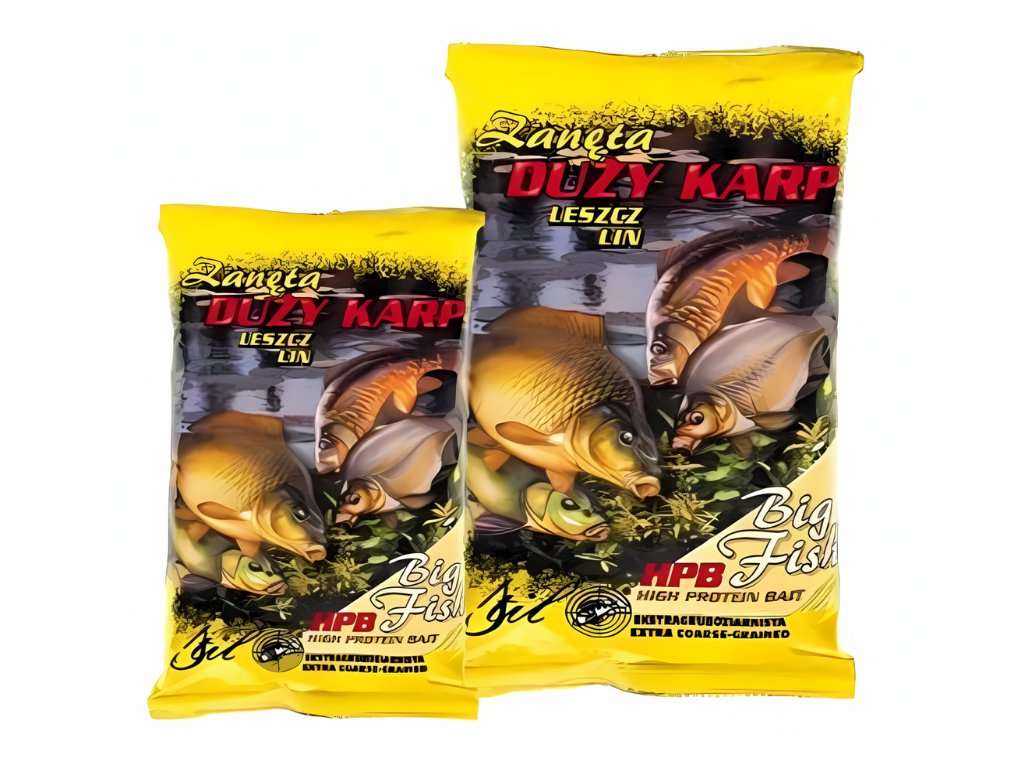 Velký kapr-krmení s hrubou granulací (zelený obal) nebo Extrahrubý (žlutý), Obsahuje kompletní sadu rostlinných přísad (až 47% bílkovin a esenciálních aminokyselin).