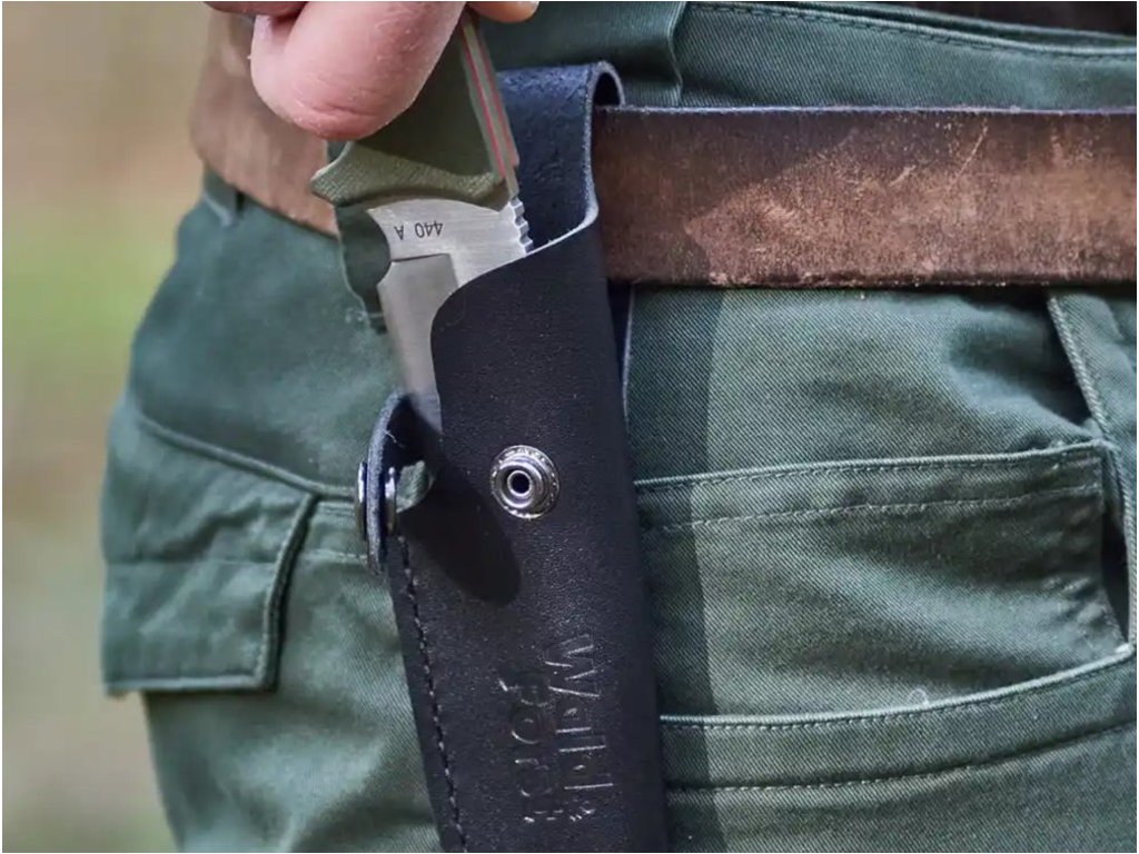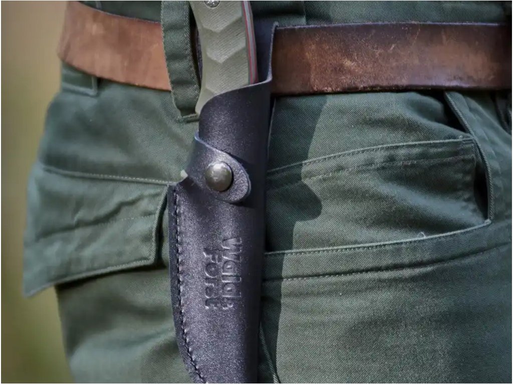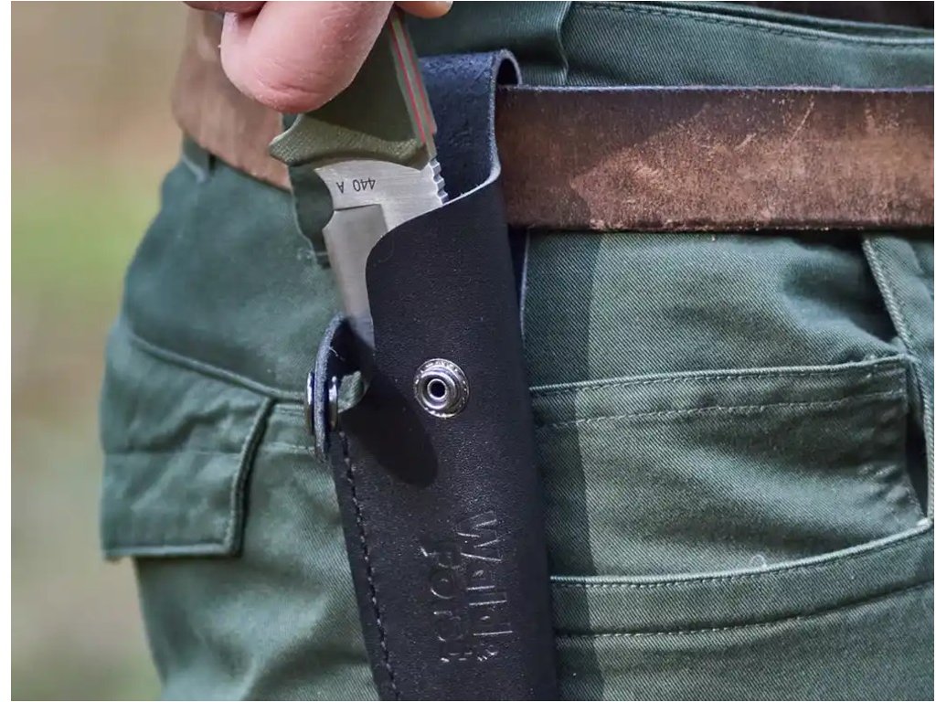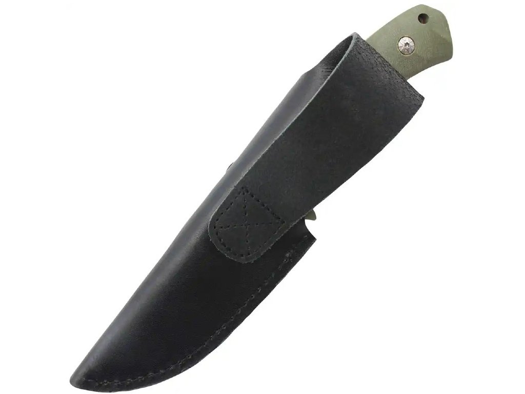 Nůž je dodáván s černým koženým pouzdrem s poutkem na opasek pro pohodlné nošení. Zapínání na patentní uzávěr zabraňuje náhodnému vyjmutí a zajišťuje bezpečné uložení. Tyto detaily podtrhují praktičnost a vysokou užitečnost nože pro outdoorové aktivity nebo lov.