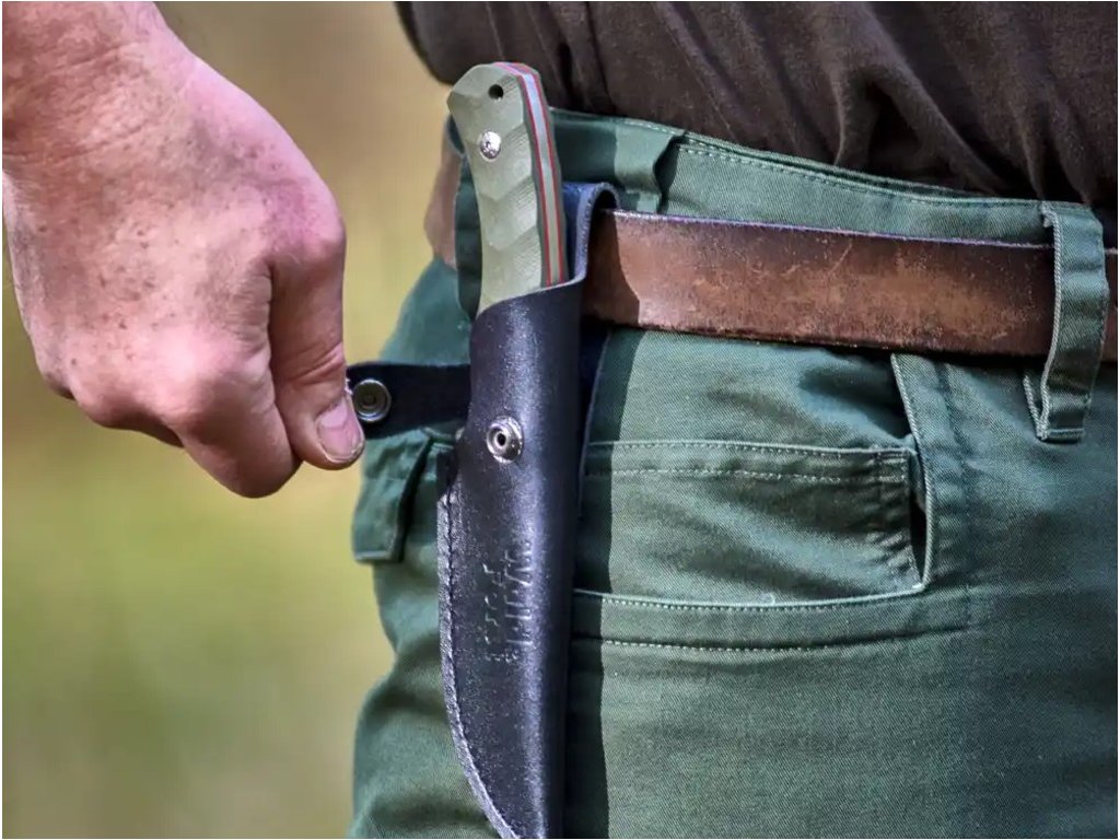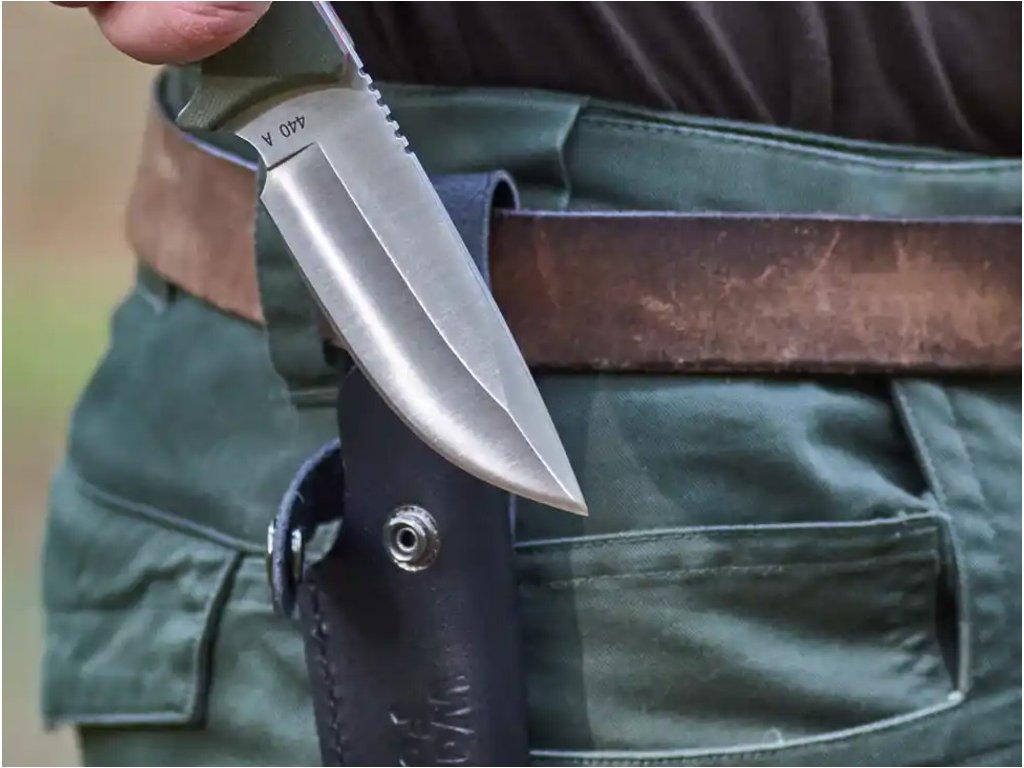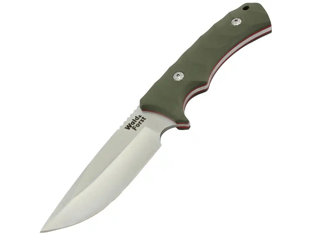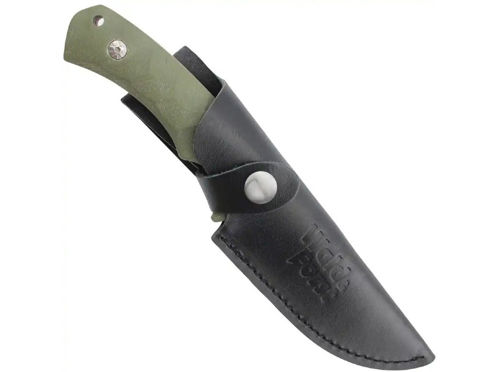 Nůž je dodáván s černým koženým pouzdrem s poutkem na opasek pro pohodlné nošení. Zapínání na patentní uzávěr zabraňuje náhodnému vyjmutí a zajišťuje bezpečné uložení. Tyto detaily podtrhují praktičnost a vysokou užitečnost nože pro outdoorové aktivity nebo lov.