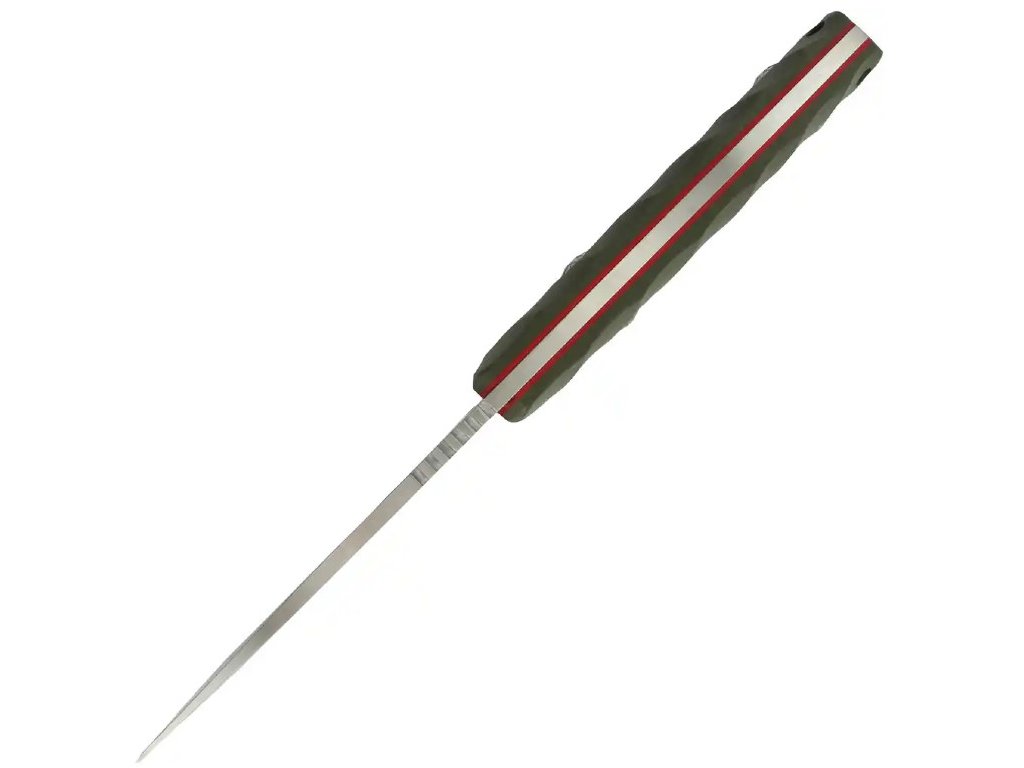 Mezi texturovanými šupinkami rukojeti se nacházejí červené kontrastní intarzie, které vytvářejí vizuální zvýraznění. Dekorativní nýty ve tvaru hvězdy dodávají noži zvláštní nádech. Integrované očko umožňuje snadné připevnění šňůrky a poskytuje tak dodatečnou bezpečnost. Díky těmto prvkům je nůž nejen funkční, ale i designově atraktivní.