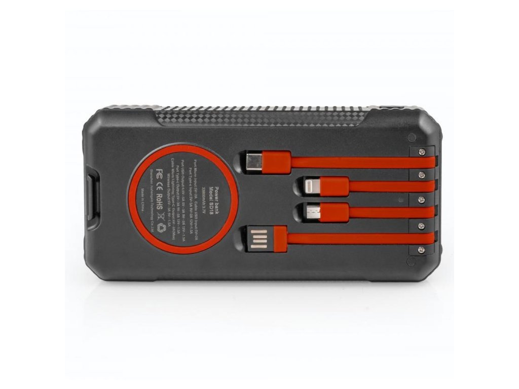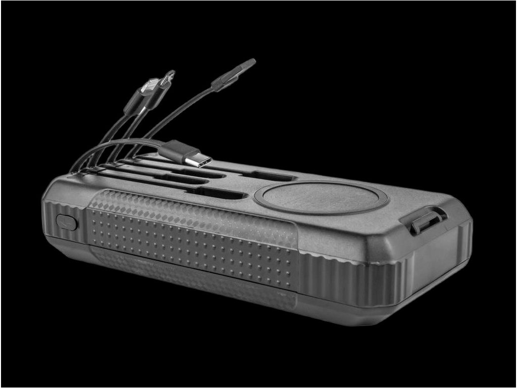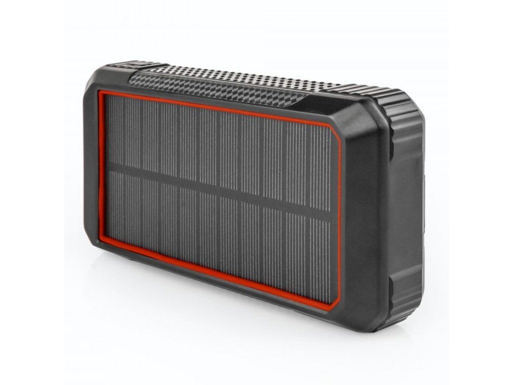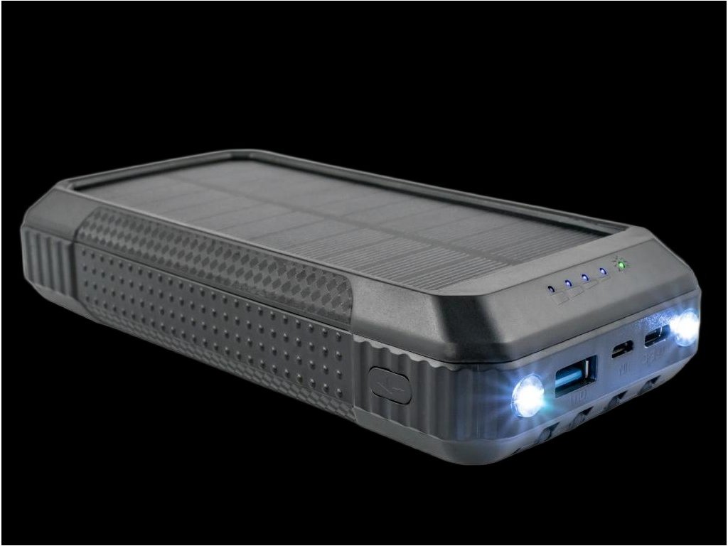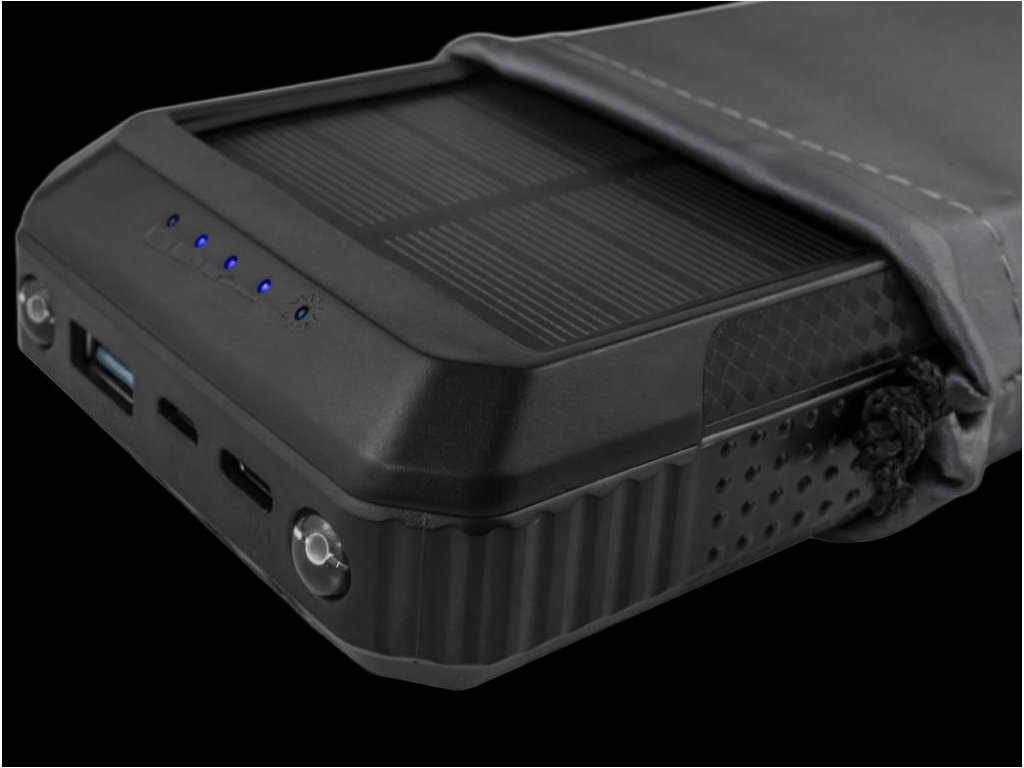 Powerbanka je velmi odolná, po stranách vyztužena nárazuvzdorným materiálem. V těle produktu jsou umístěny dvě výkonné LED diody s funkcemi přísvit, SOS a stroboskop. Je tak skvělým parťákem k outdoorovému dobrodružství, kde vás díky velké kapacitě baterie, solárnímu panelu, LED a pevné konstrukci nenechá nikdy ve štychu. Chytrým detailem je otvor pro šňůrku.