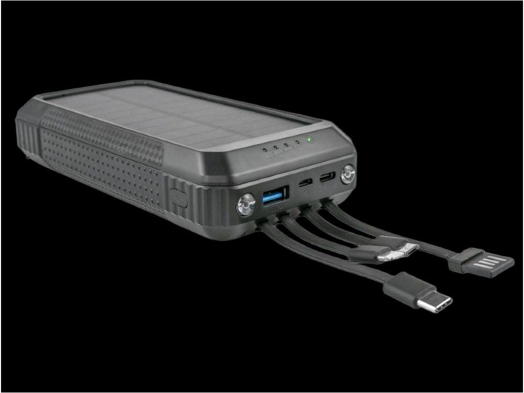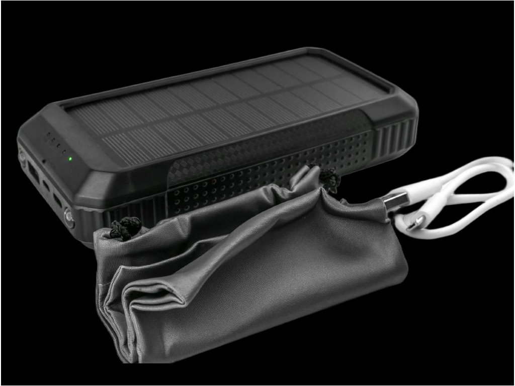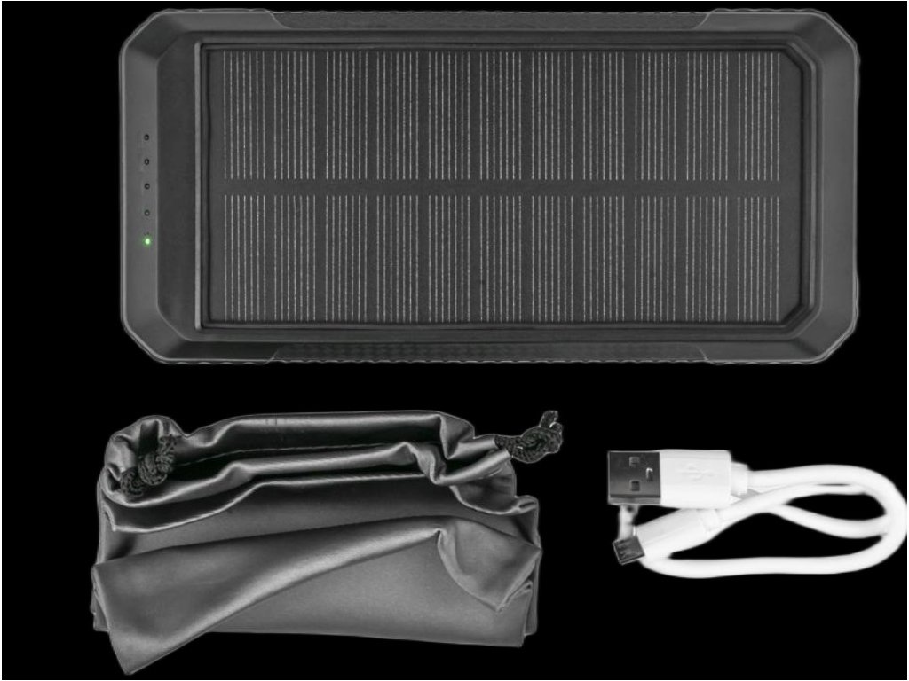 - solárním panelem (2W, nejedná se o dominantní způsob dobíjení, pro dobíjení powerbanky vždy preferujte nabíjení z elektrické sítě, solární nabíjení je vhodné jako doplňkové dobíjení v přírodě a jiných outdoorových aktivitách).