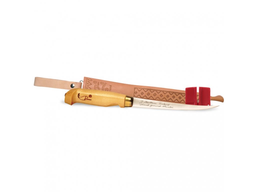 Nádherný, klasický, elegatní styl a design tohoto filetovacího nože potěší oko i srdce každého uživatele. Kvalitní švédská ocel a rukojeť je z finské břízy. Kožené pouzdro je zdobeno rybářskými motivy.