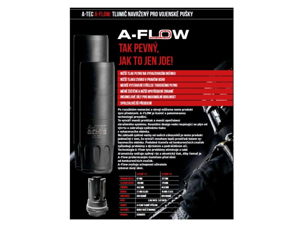 A-TEC A-FLOW - kompletní popis technická data, seznam ráží a systémů upnutí v katalogu A-TEC v Českém jazyce ke stažení na našich stránkách. TOP v technologii výroby tlumičů, určený pro extrémní zatížení ve full auto režimech střelby Unikátní technologie A-FLOW významně snižuje tlak a tok plynů zpět směrem k výchozímu okénku zbraně.