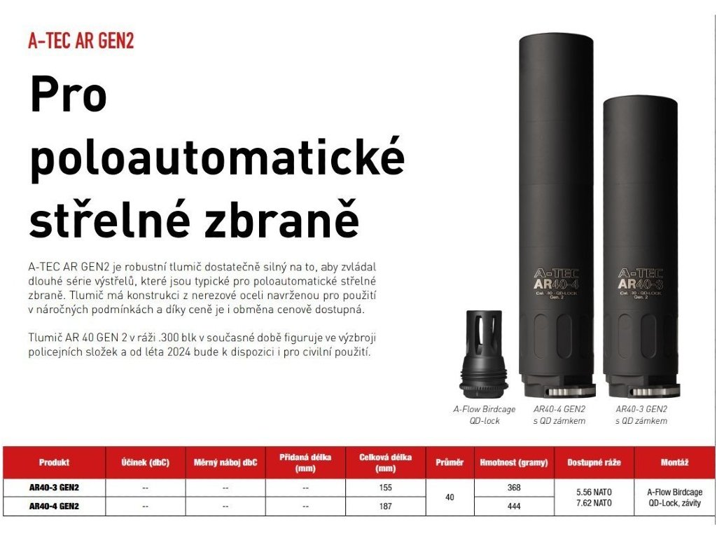 A-TEC AR GEN2 je robustní tlumič dostatečně silný na to, aby zvládal dlouhé série výstřelů, které jsou typické pro poloautomatické střelné zbraně. Tlumič má konstrukci z nerezové oceli navrženou pro použití v náročných podmínkách a díky ceně je i obměna cenově dostupná. Tlumič AR 40 GEN 2 v ráži .300 blk v současné době figuruje ve výzbroji policejních složek a od léta 2024 bude k dispozici i pro civilní použití.