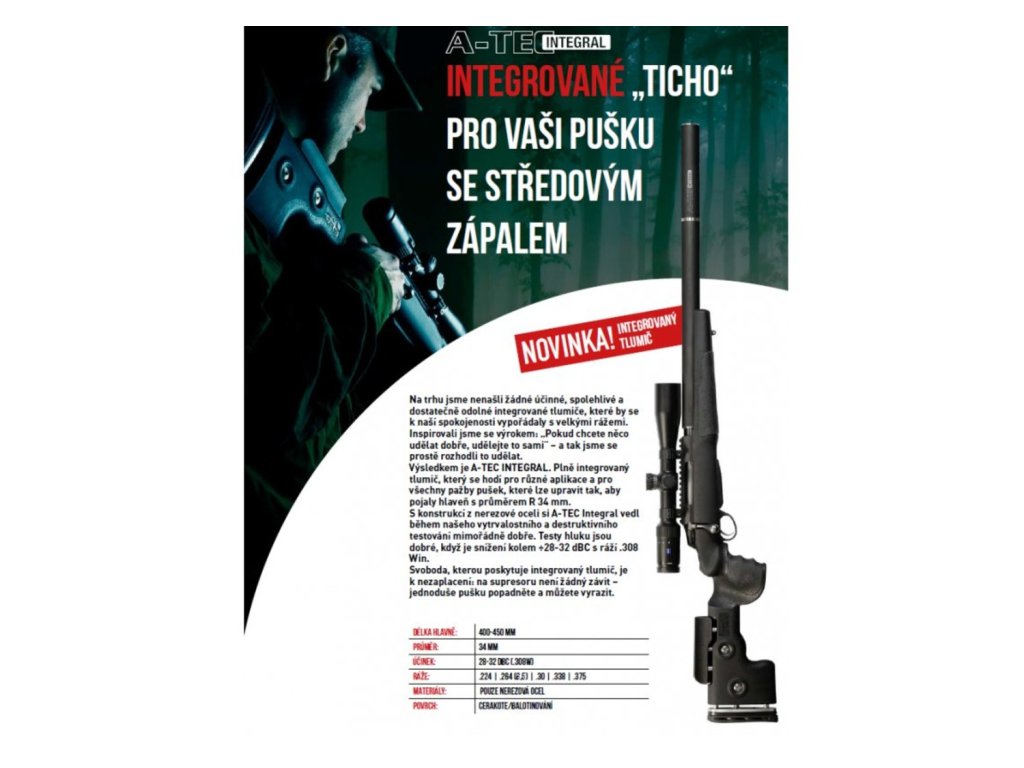 Nový tlumič Integral od firmy A-TEC je špičkovým produktem, který nabízí zcela odlišné parametry než jiné "integrované" tlumiče na trhu pro ráže se středový zápalem. Celonerezová konstrukce, povrchová úprava Cerakote. U zbraní, na které se má tlumič instalovat dodatečně, je nutná úprava hlavně puškařem. Určeno pro pažby které lze upravit na průměr hlavně 34mm.