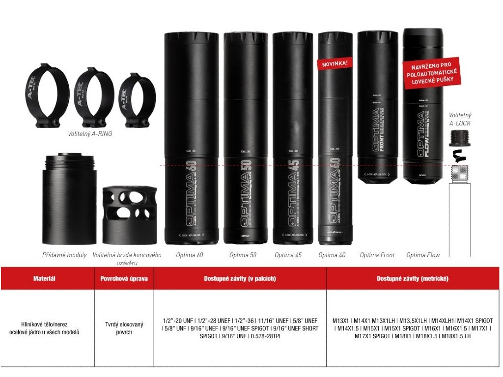 Řada A-TEC Optima zahrnuje šest prémiových modelů navržených s důrazem na modularitu, odolnost a univerzální použití pro lovecké i sportovní zbraně. Všechny modely mají modulární konstrukci, která umožňuje výměnu předního modulu a tím přizpůsobení tlumiče různým rážím v rozmezí .224" – .375".