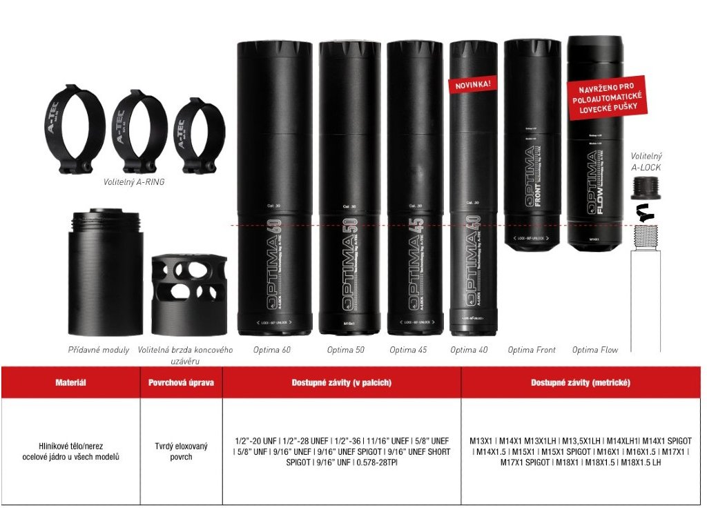 A-TEC Optima představuje rodinu modulárních tlumičů navržených pro moderní lovecké a sportovní zbraně. Nízká hmotnost, výkonné vnitřní jádro a vyměnitelné přední moduly umožňují jeden tlumič použít pro různé ráže. Varianta Optima Flow s technologií A-FLOW je speciálně vytvořena pro samonabíjecí pušky a výrazně snižuje blow-back plynů do závěru.