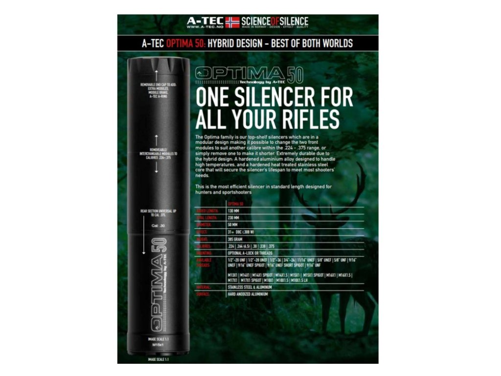 A-TEC Optima - kompletní popis technická data, seznam ráží a systémů upnutí v katalogu A-TEC v Českém jazyce ke stažení na našich stránkách. Modely Optima 50, 60 a 45 jsou určeny pro lovecké a sportovní opakovací, samonabíjecí zbraně, bez předních mířidel. Tlumič jde o 8cm zpět přes hlaveň a přidává tak pouze 15cm k celkové délce zbraně. Přední modul tlumiče je výměnný a lze tak mít jeden tlumič s výměnou sadou modulů pro různé ráže. Model Optima Front je určen pro zbraně s předními mířidly a celou svojí délkou jde dopředu před ústí, opět lze měnit přední modul za modul pro jiné ráže Model Optima Flow je určen speciálně pro samonabíjecí lovecké a sportovní zbraně. Technologie A-FLOW snižuje tlak a tok plynů zpět směrem k výchozímu okénku zbraně. Nejde zpět přes hlaveň a lze měnit přední modul