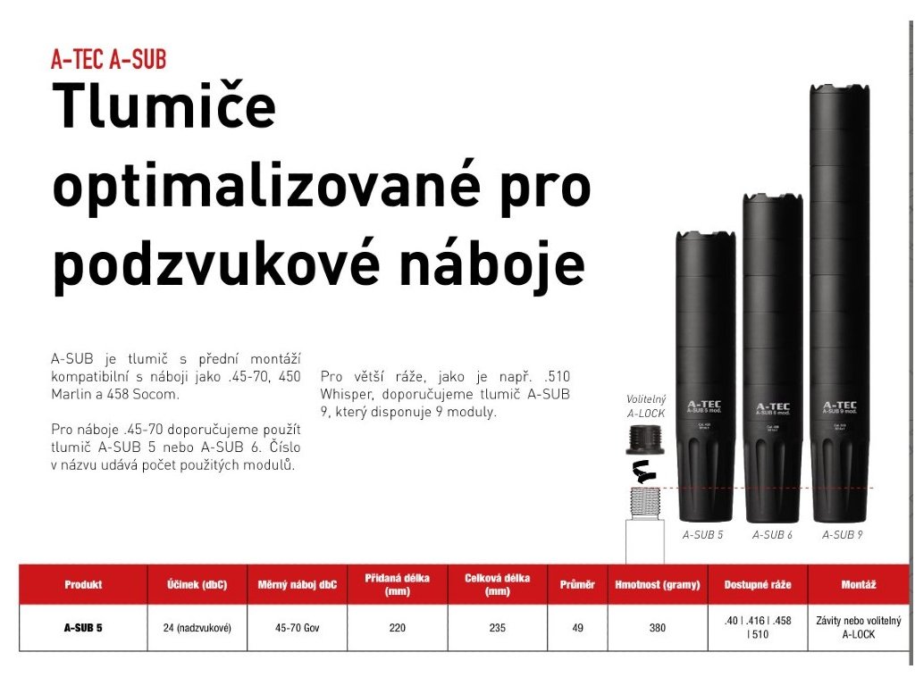 A-TEC SUB 5 je vysoce výkonný, modulární tlumič navržený pro zbraně v ráži až do .458" (11,65 mm). Konstrukce byla optimalizována pro maximální účinnost jak u subsonických, tak i u supersonických konfigurací, přičemž bere v úvahu nižší úsťové rychlosti, které bývají u některých velkorážových nábojů běžné. Díky modulárnímu provedení můžete upravovat vnitřní objem a akustický profil tlumiče podle používané munice a požadovaného kompromisu mezi hmotností a útlumem.