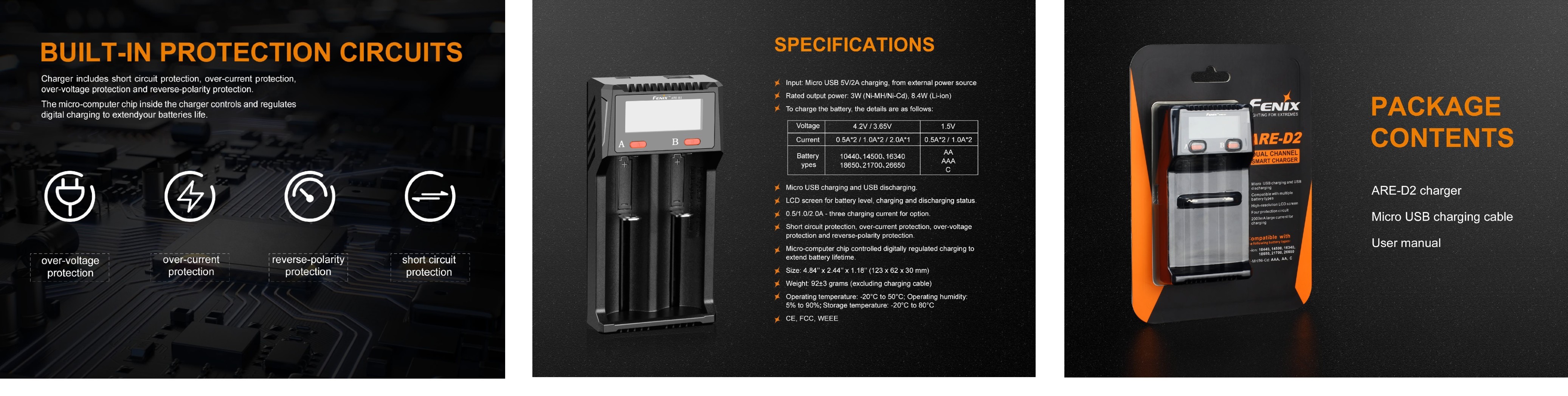 Kompaktní dvoukanálová USB nabíječka Fenix ARE-D2 na Li-ion a NiMH/NiCd akumulátory. Při vložení nabitého Li-ion akumulátoru funguje i jako záložní zdroj (powerbanka) pro nabíjení USB zařízení (svítilny, mobilní telefony, MP3 přehrávače a další). Díky kompaktním rozměrům je nabíječka vhodná zvláště na cesty. Automaticky rozpozná vložený typ akumulátoru a zvolí optimální nabíjecí algoritmus. Nabíječka je vybavena LCD displejem, který zobrazuje aktuální napětí akumulátorů, typ nabíjených baterií a další informace. Každý nabíjecí slot je monitorován nezávisle, takže lze najednou nabíjet baterie různých velikostí, kapacit a dokonce i různých chemií (Li-Ion i NiMH/NiCd je možné nabíjet najednou). U každého slotu lze zvolit nabíjecí proud 500 - 1000 mA. 2000 mA pak lze nastavit při nabíjení jednoho akumulátoru ve slotu B. Nejvyšší nabíjecí proud lze navolit pouze při nabíjení jednoho akumulátoru.